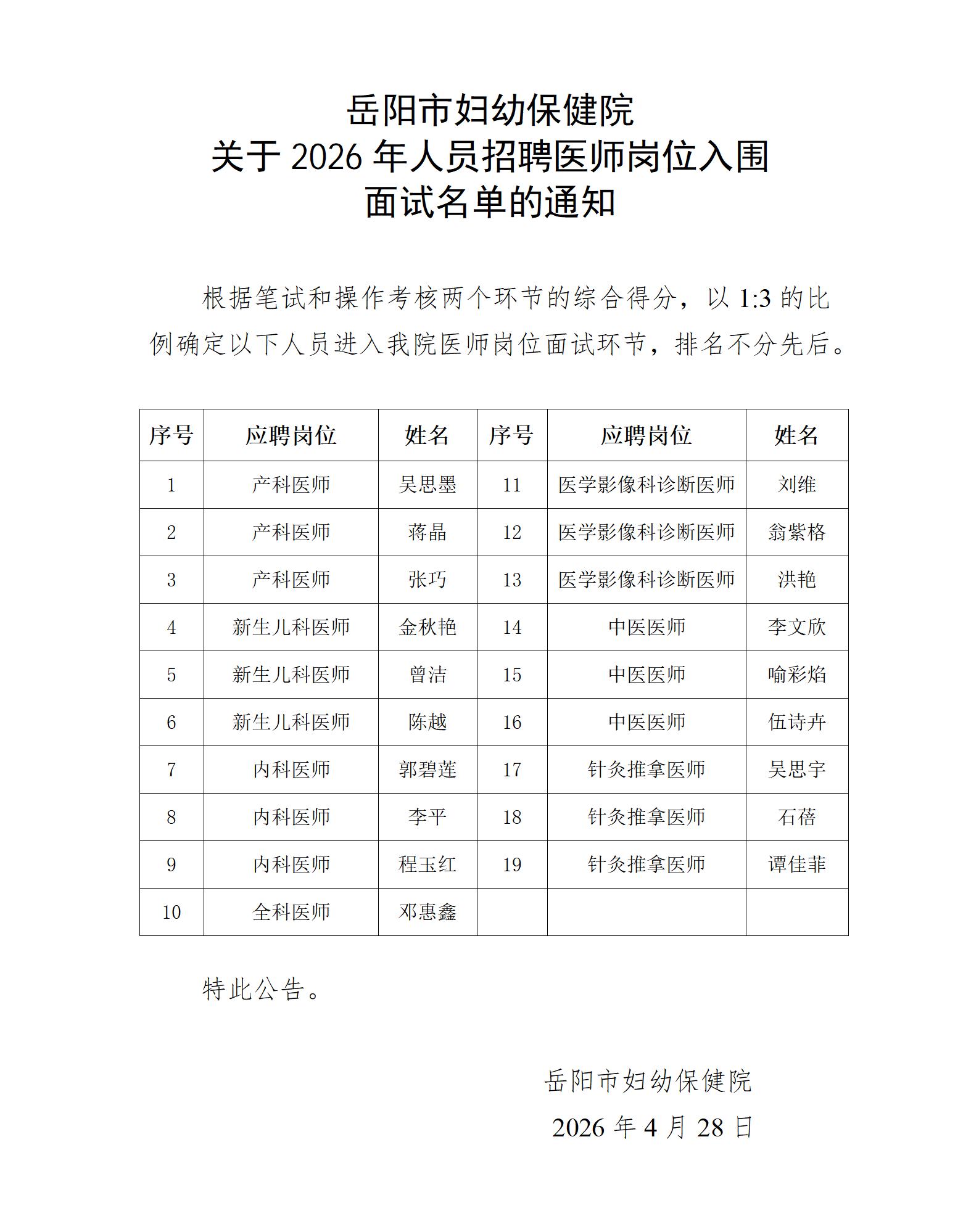 岳阳市妇幼保健院 关于2026年人员招聘医师岗位入围 面试名单的通知